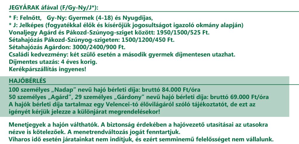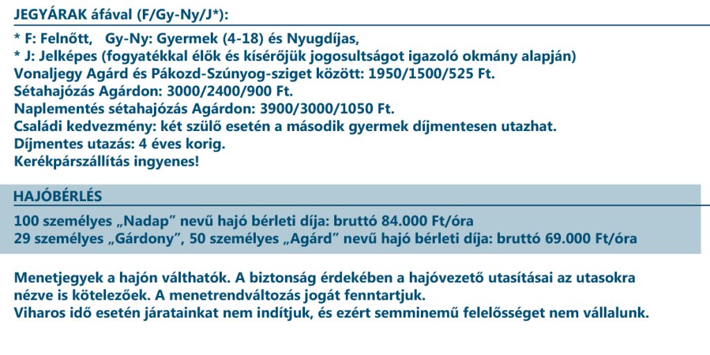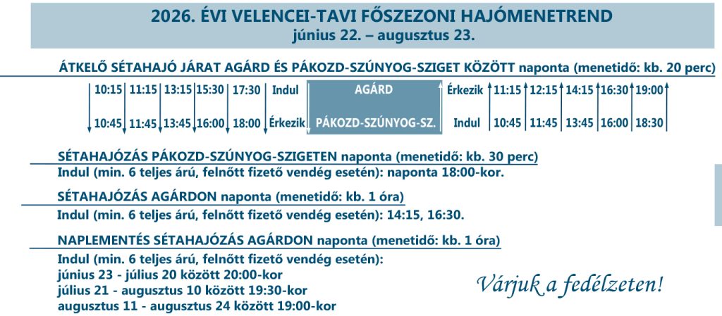 Az átkelő sétahajó járataink kiválóan alkalmasan sétahajózásra: 20 perces sétahajózás át Agárdról a Szúnyog-szigetre a nádason keresztül kacsázva, majd kis várakozás után vissza sétahajózás egy szintén 20 perces hajóúttal. Kb. 1 órás program összesen.